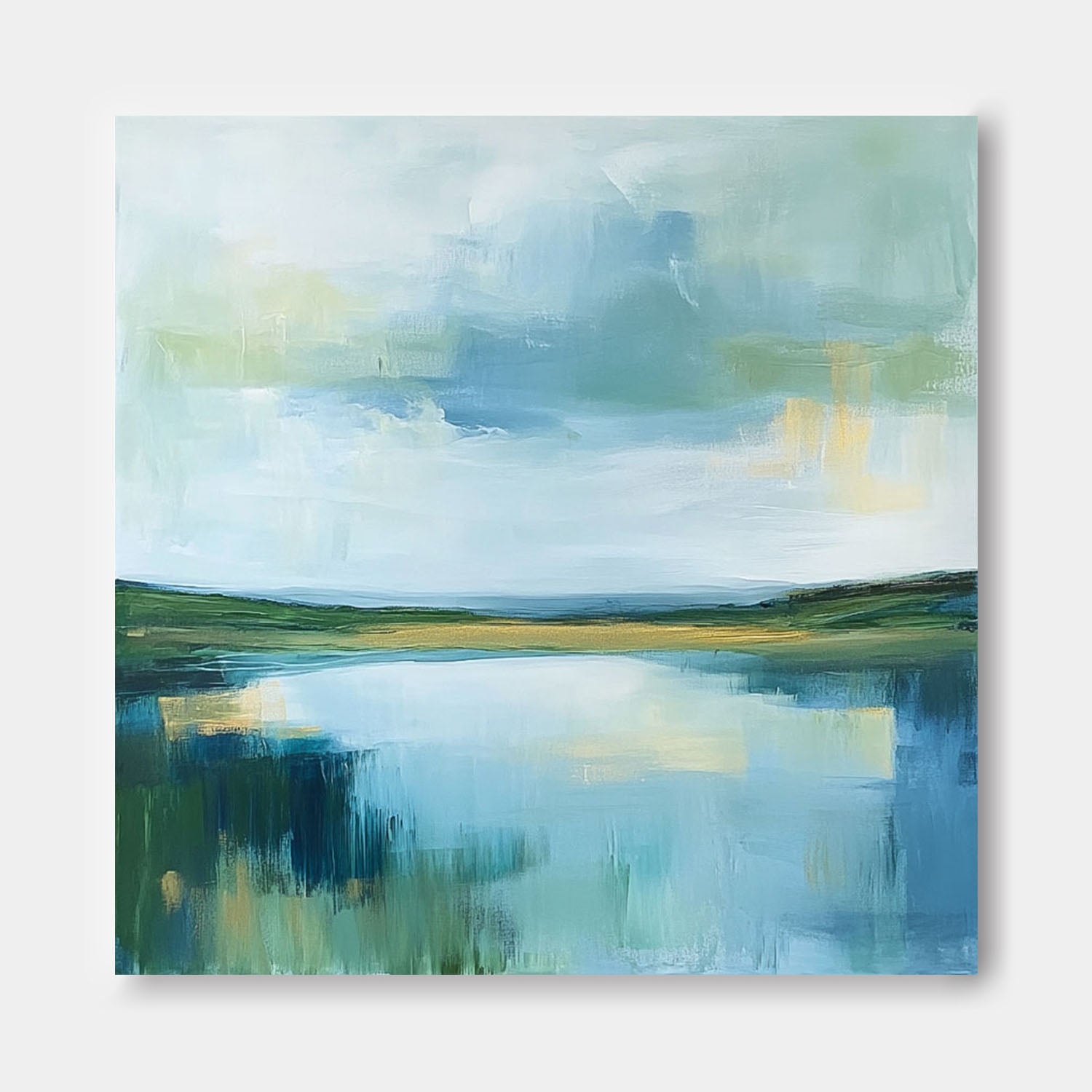 Green Countryside Landscape Artwork Large Blue Texture Wall Art Framed Abstract Lake Landscape Oil Painting