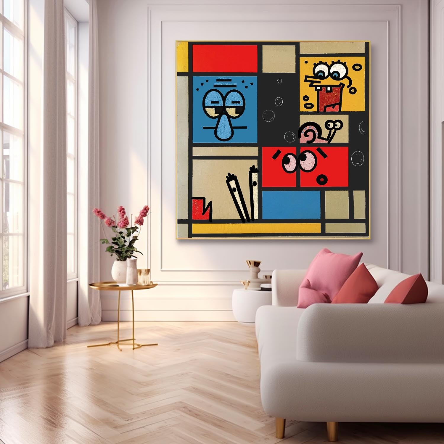 Geometric Cartoon Large Texture Abstract Wall Art Abstract SpongeBob Oil Painting Canvas Framed Home Decor