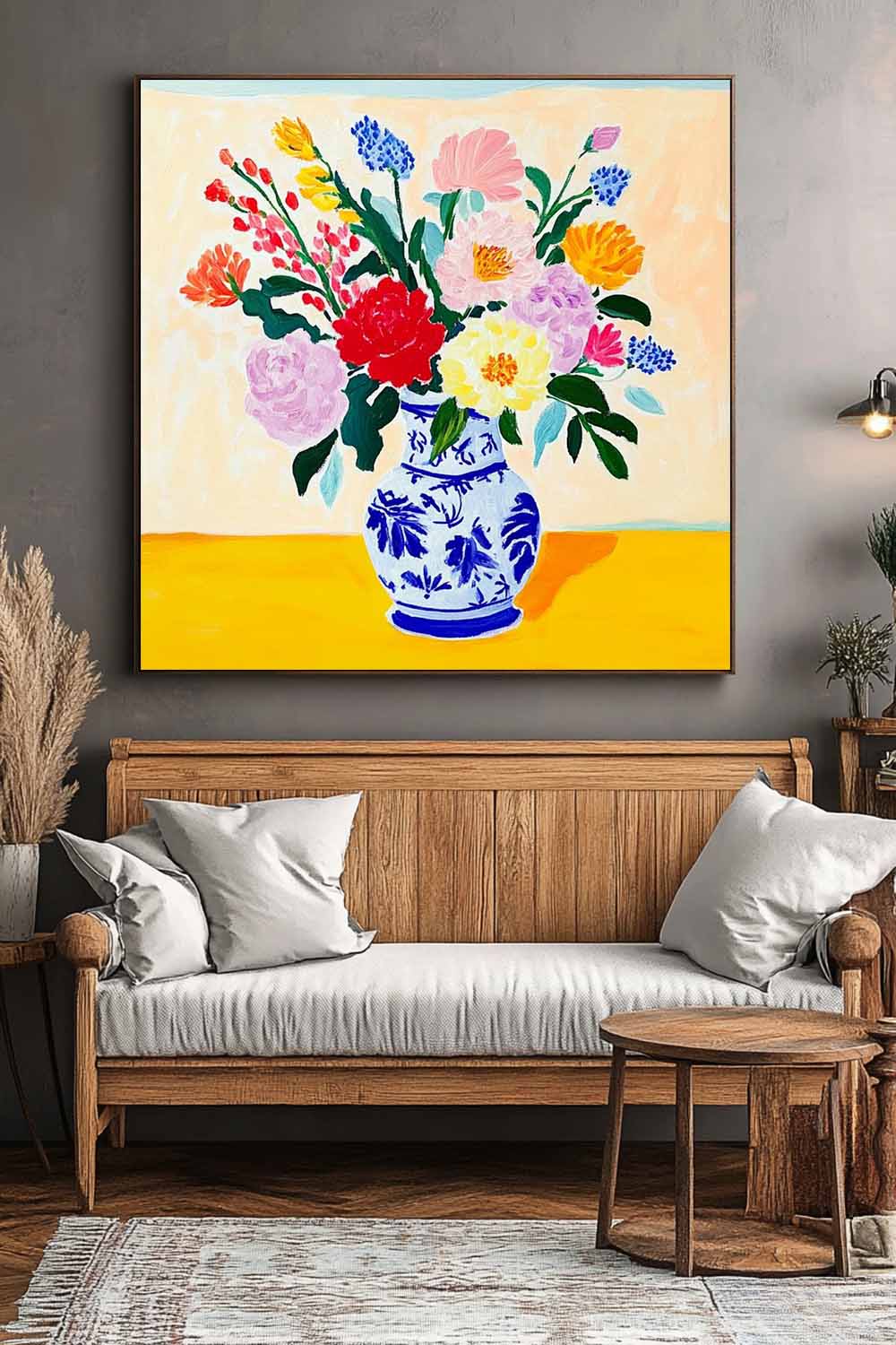 Original Flower Square Vase Artwork Floral Texture Painting on Canvas Large Illustration style Wall Art