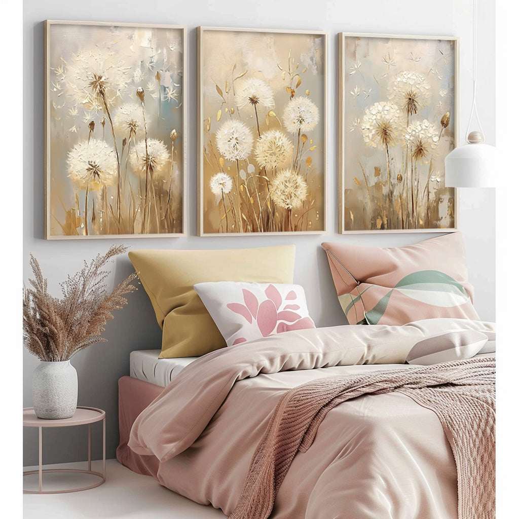 Set of 3 white Dandelion Abstract Oil Paintings Contemporary Flower Canvas Wall Art Floral Spring Artwork