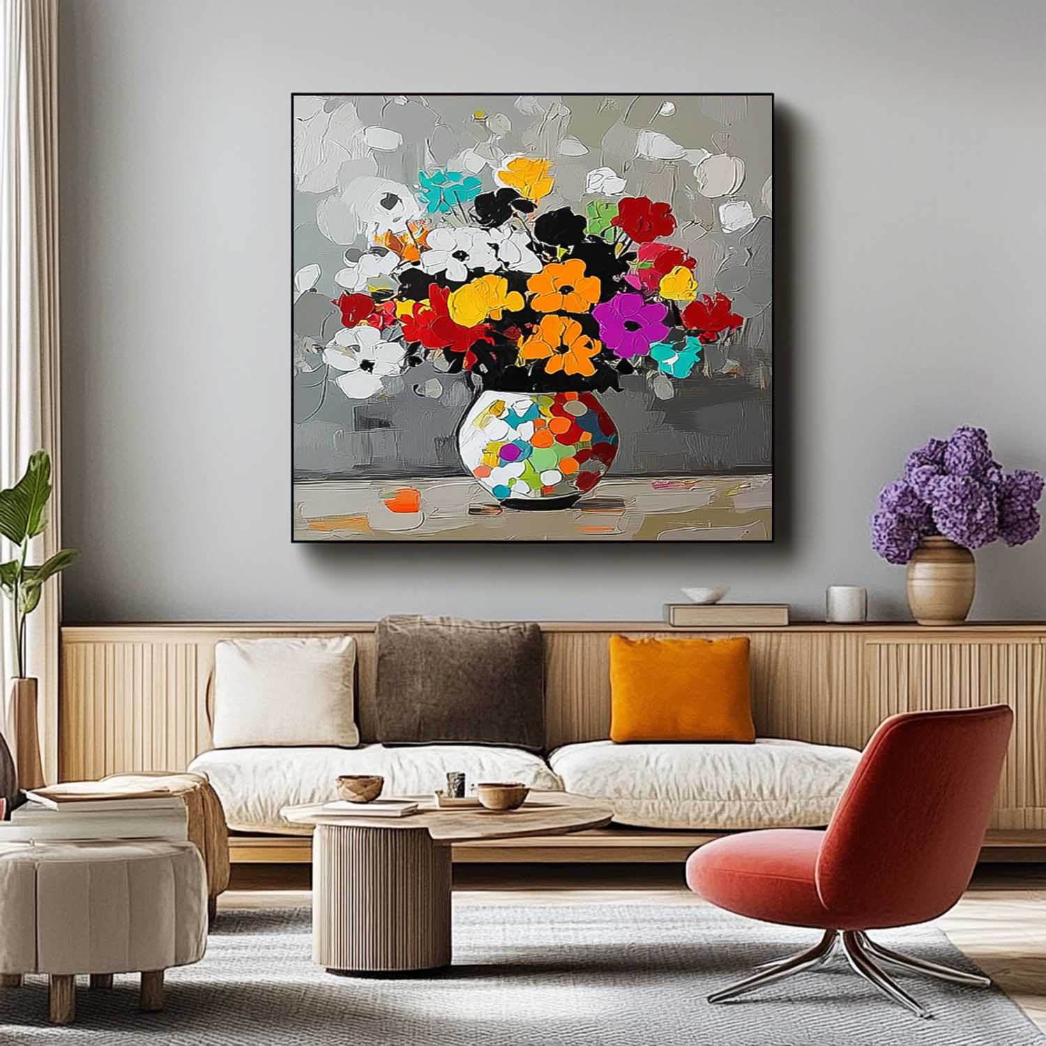 Original Flower Square Vase Artwork Floral Texture Painting on Canvas Large Color Handmade Wall Art