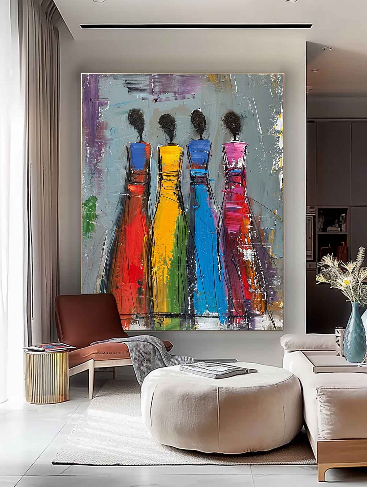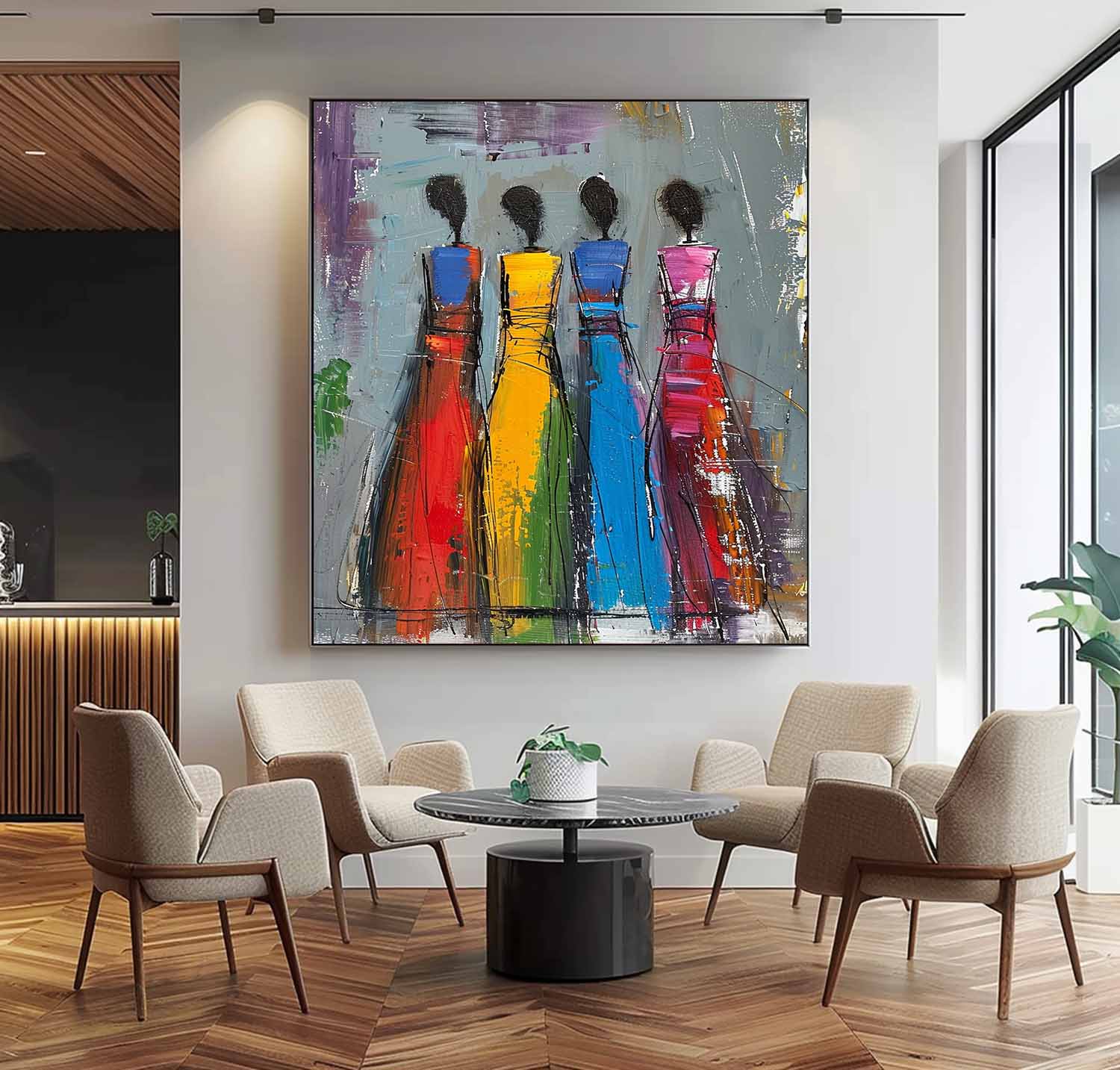 Colorful Four Women Silhouettes Painting Original Modern Wall Art Big Multicolor Girl Painting Framed